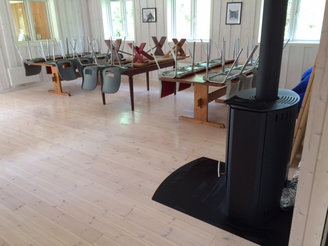 Der er 35 køjepladser fordelt på 3 rum. Stor spisesal med brændeovn, opholdsrum og stort køkken. 2 toiletter og et badeværelse.